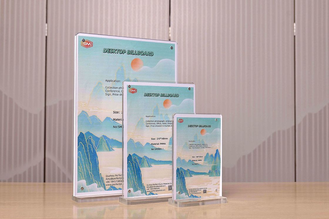 2) Praktyczny wygląd: Przejrzysty znak stołowy ma podwójną stronę, dzięki czemu można w nim oglądać materiały, zdjęcia i plakaty.